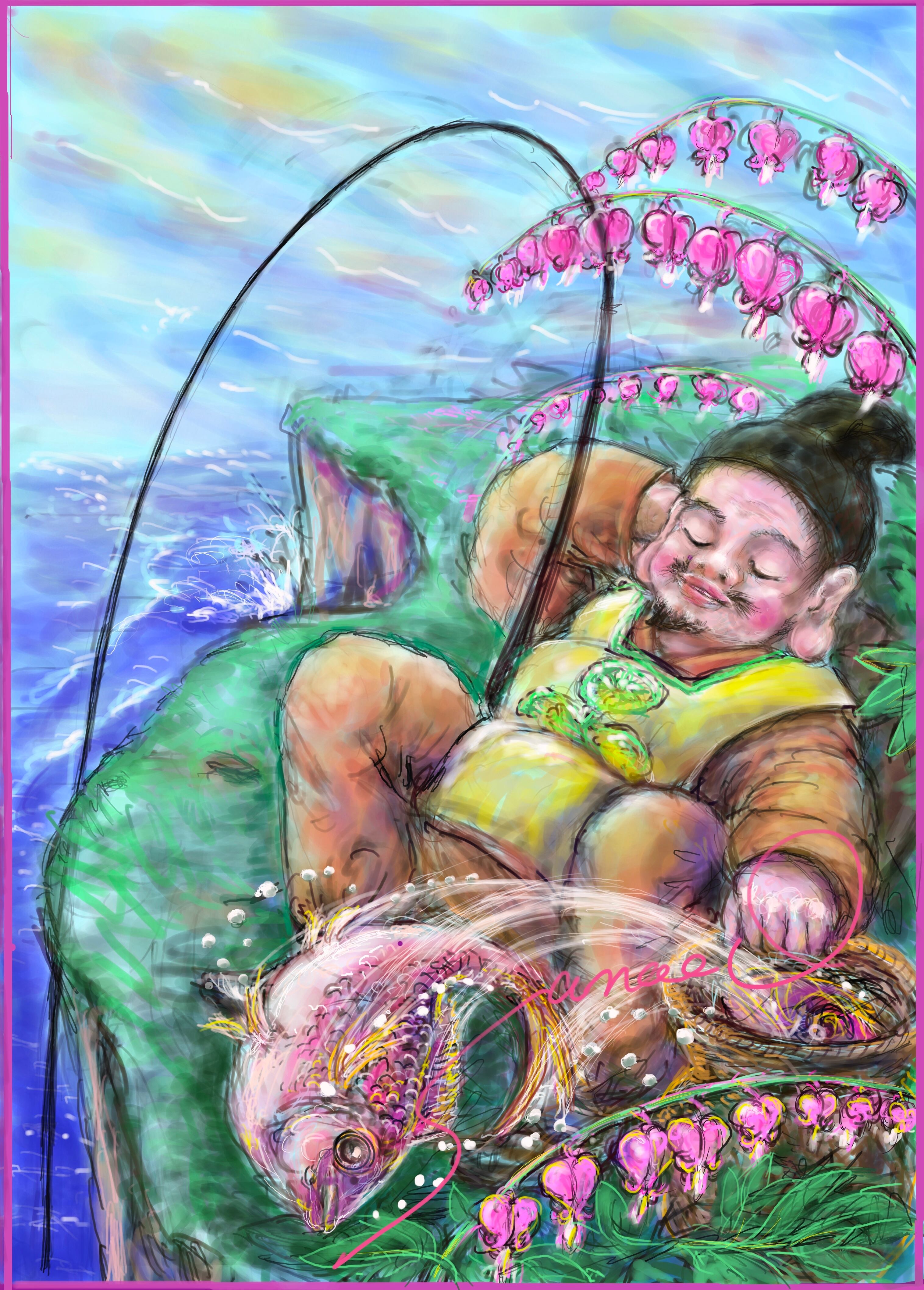 エビス様の休日は、いつもと変わらず海に釣りに行きます。でも、眠くて毎回昼寝しています。ドドーンという波音がBGM、釣った魚は、びくから飛び出し海に逃げていき、竿はしなって魚が
