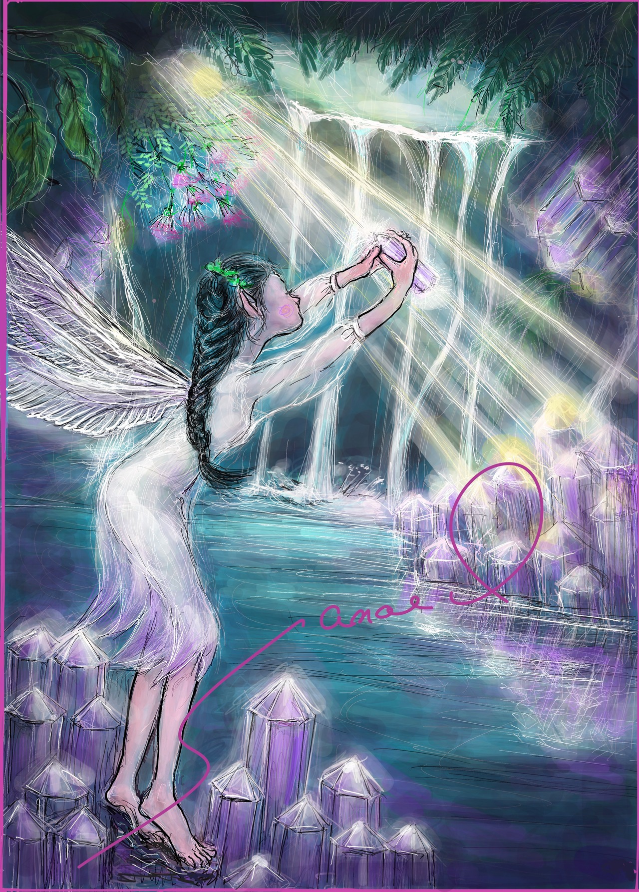 光が差し込むと、そこは光輝く紫水晶の世界。川の水面にも光が映っています。ここは小さな虫たちとフェアリーの暮らすところです。