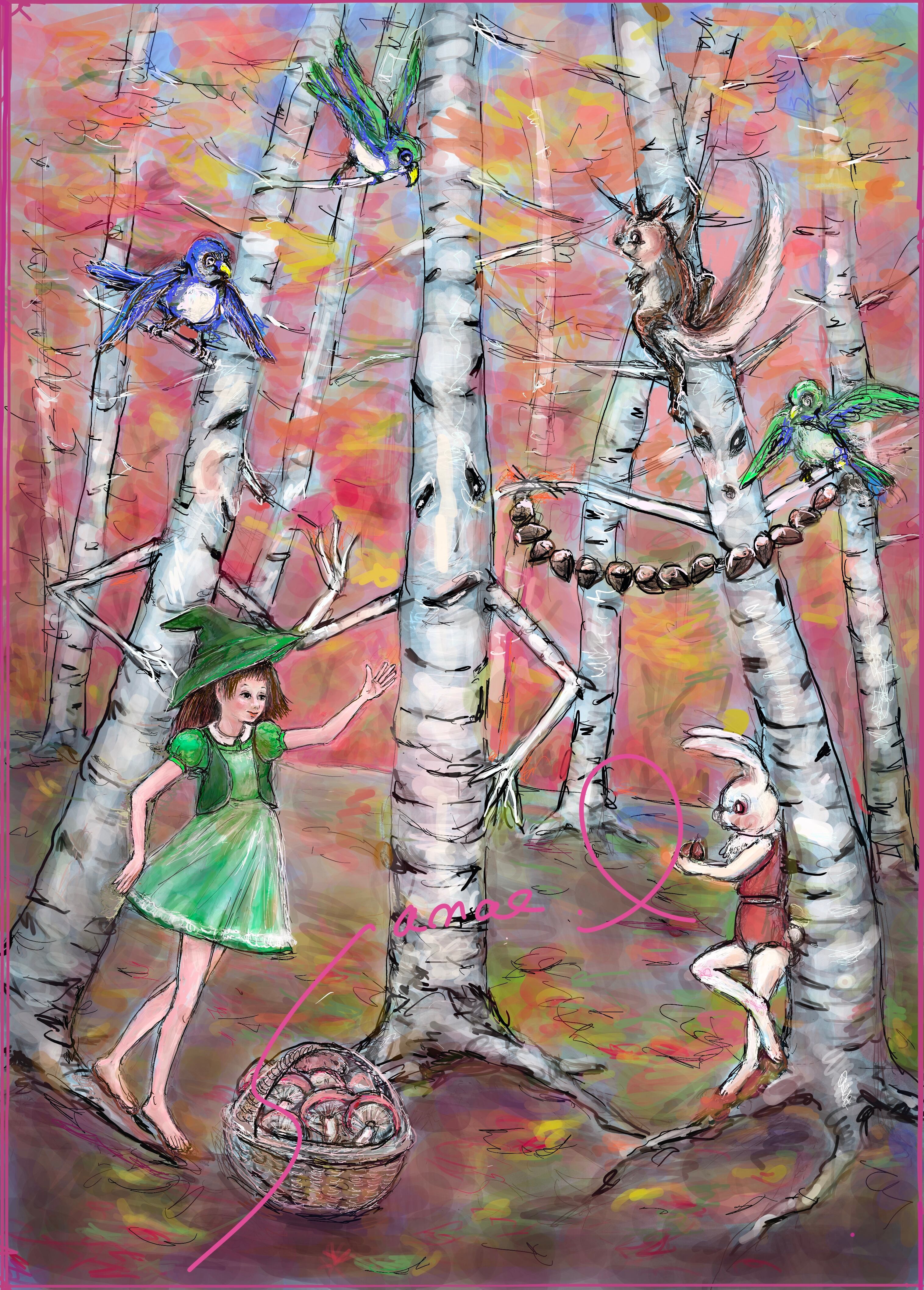 木々の葉が赤や黄色に輝く頃、きのこ狩りのみどりちゃんは森の仲間と久しぶりに会いました。白樺の木たちも一緒に、楽しいおしゃべりが始まります。里の話や、木の実がなっている話。