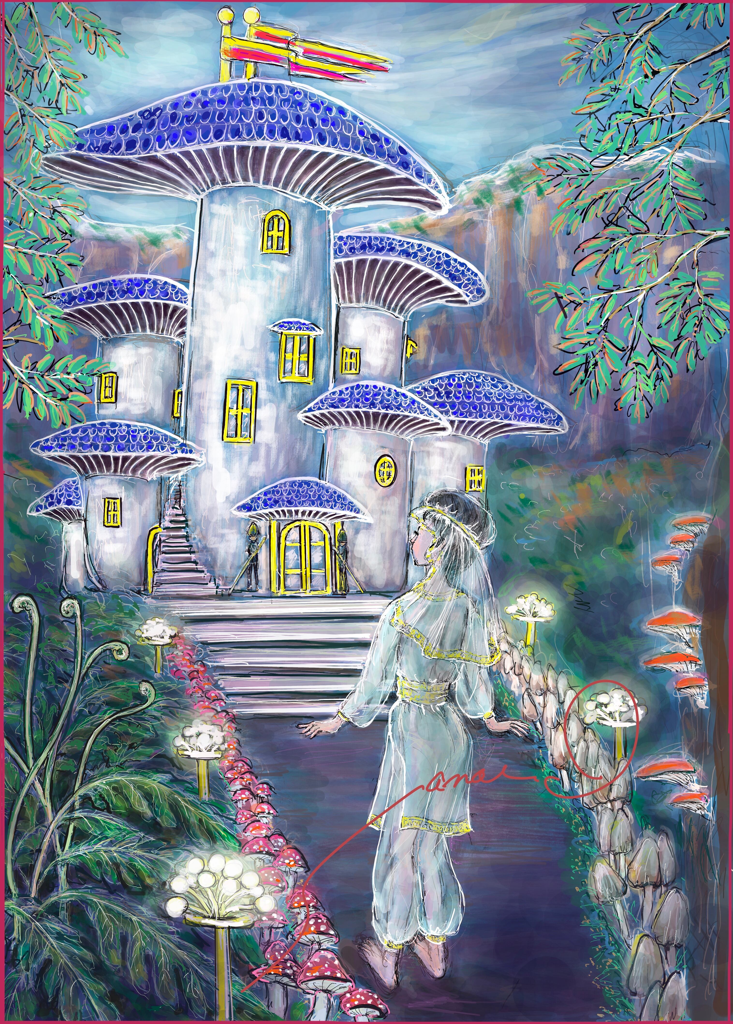 森の道をさまよっていると、突然現れたきのこのお城、門番が2人立っています。お城の中は