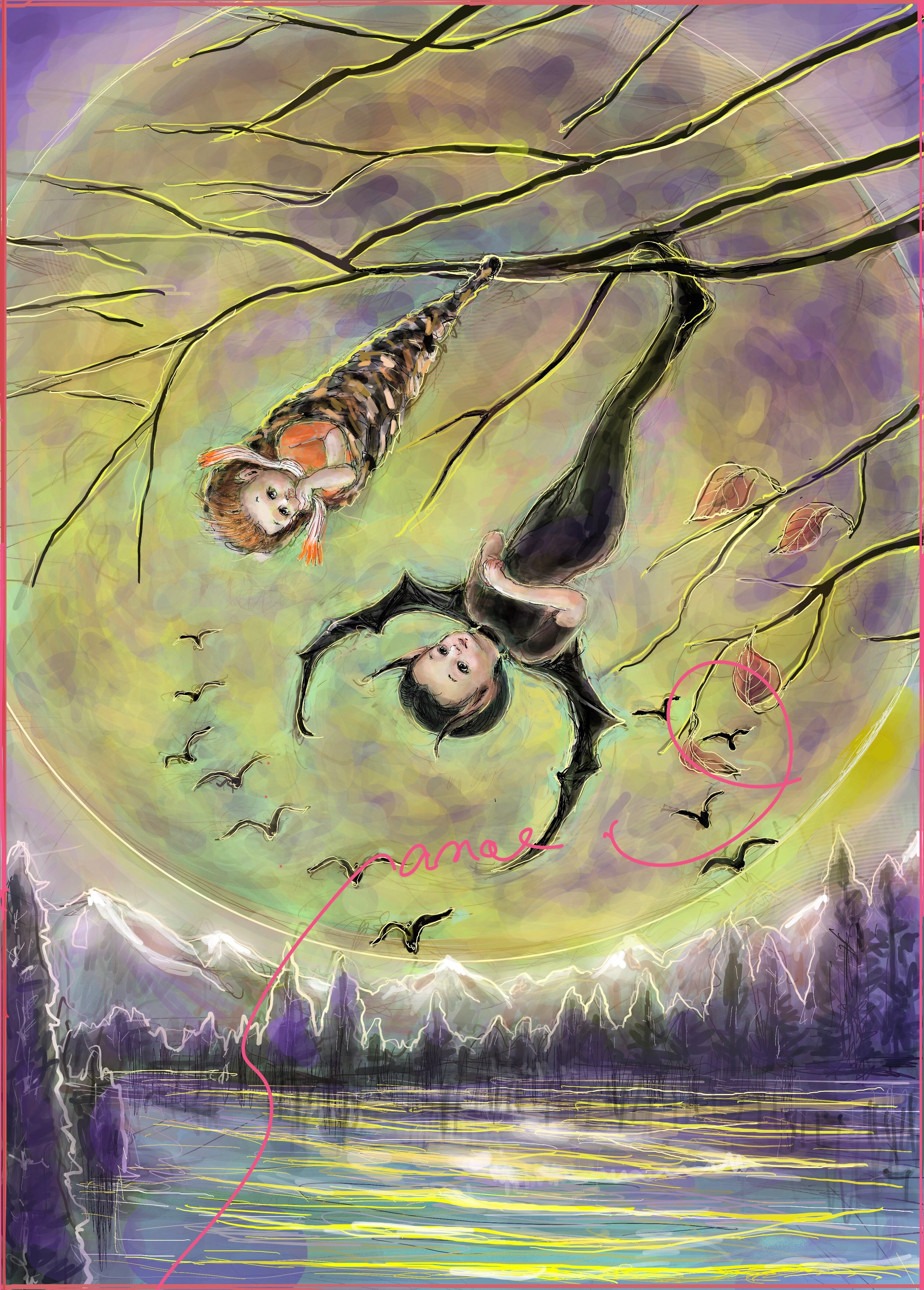 コウモリの男の子は、みのむし君と毎晩逆さまになってユラユラしながら遊んでいます。満月の夜、月は水面に映り特別キラキラと頭の上に輝いていました。みのむし君は、もう眠くて仕方ないので春になったら又遊ぼうと何回もあくびをしました。