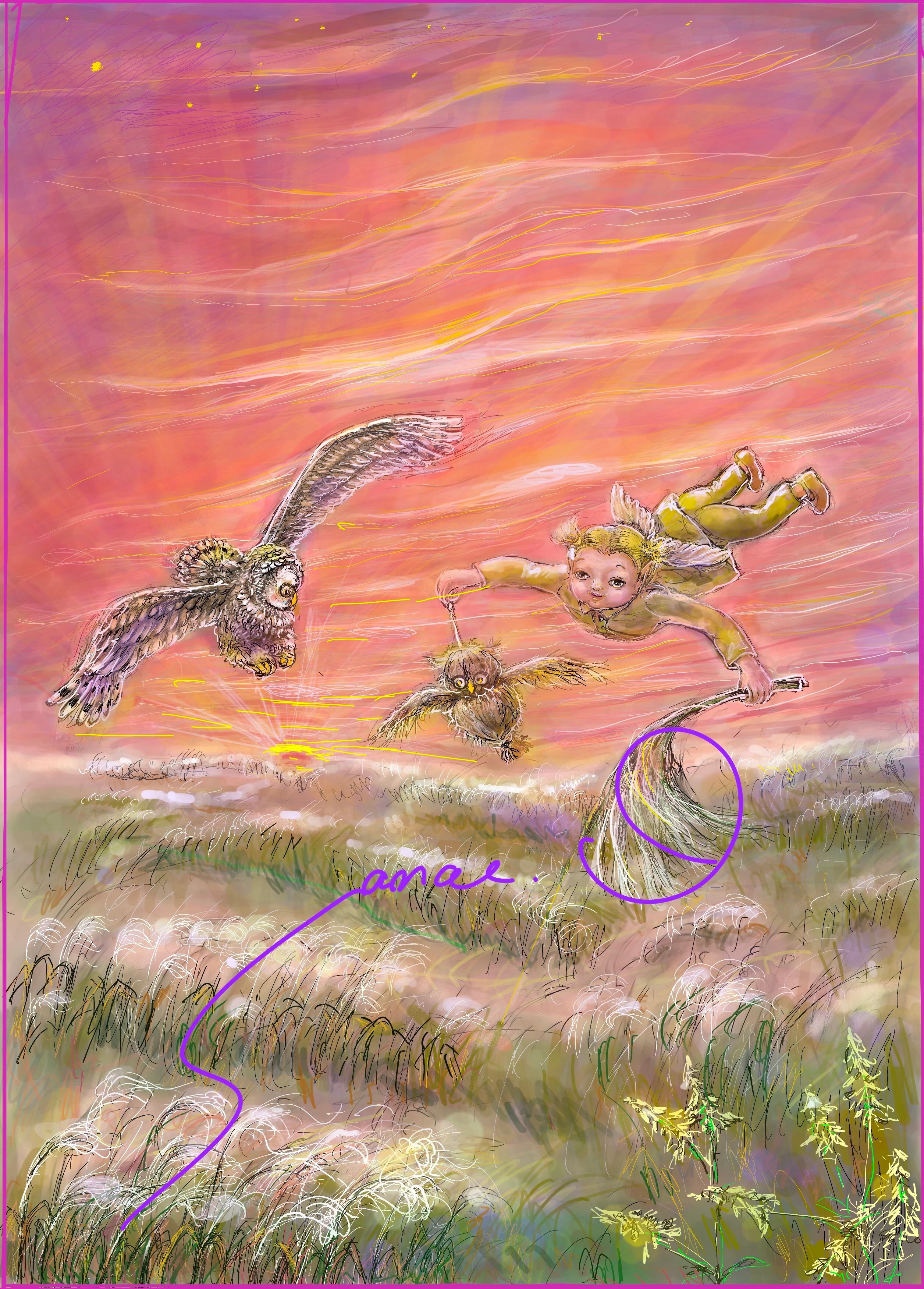 小さな魔法使いのヤーボーは、ススキの穂でふくろうを作りました。とっても上手に可愛くできたので、ヤーボーはススキの原で一緒に飛んで見る事にしました。空は完璧に真っ赤な夕焼け、枯れかかった穂が白く光っています。