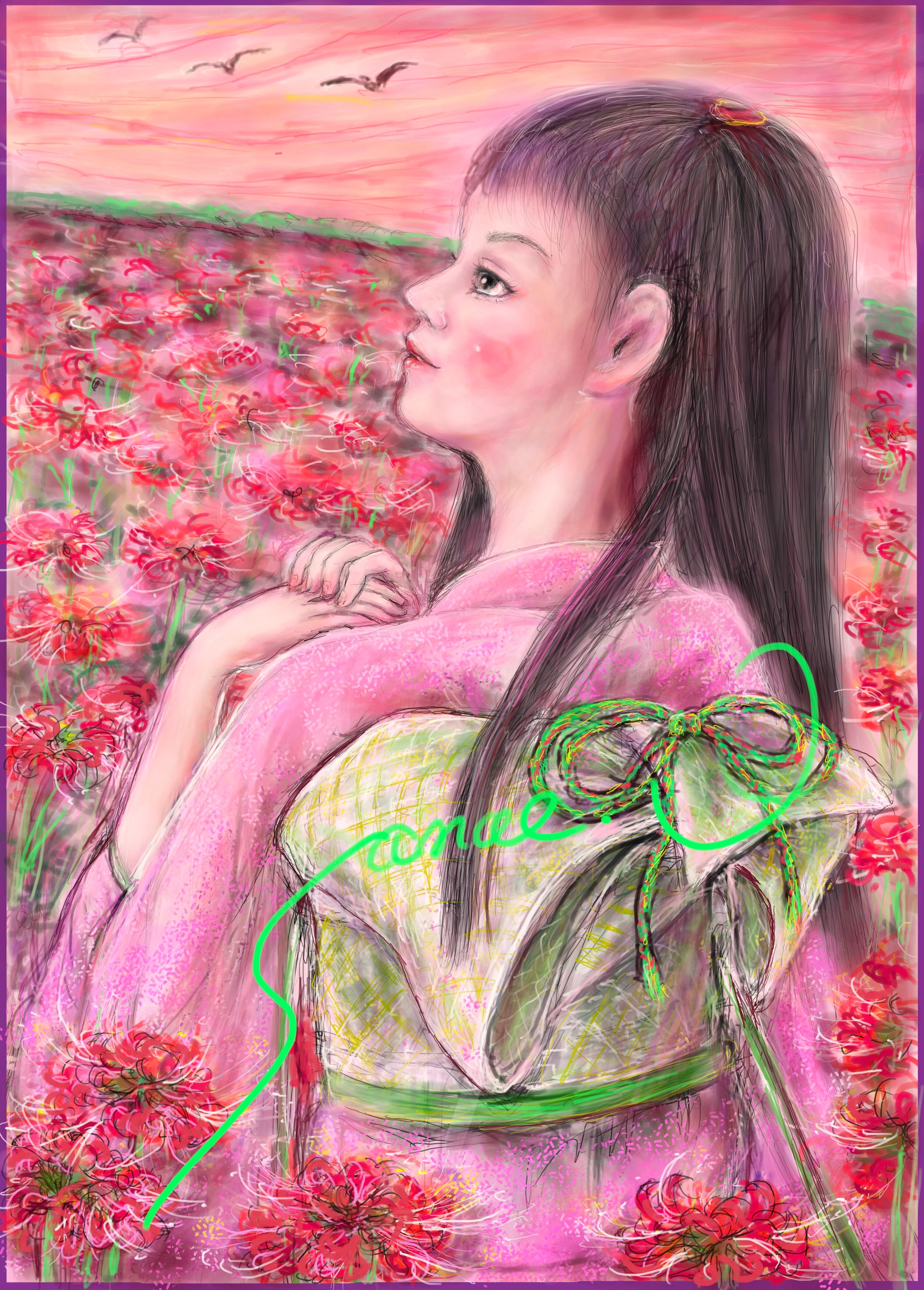 夕暮れになっても曼珠沙華の花の赤で辺りはとても明るく、そこだけ別世界のようです。