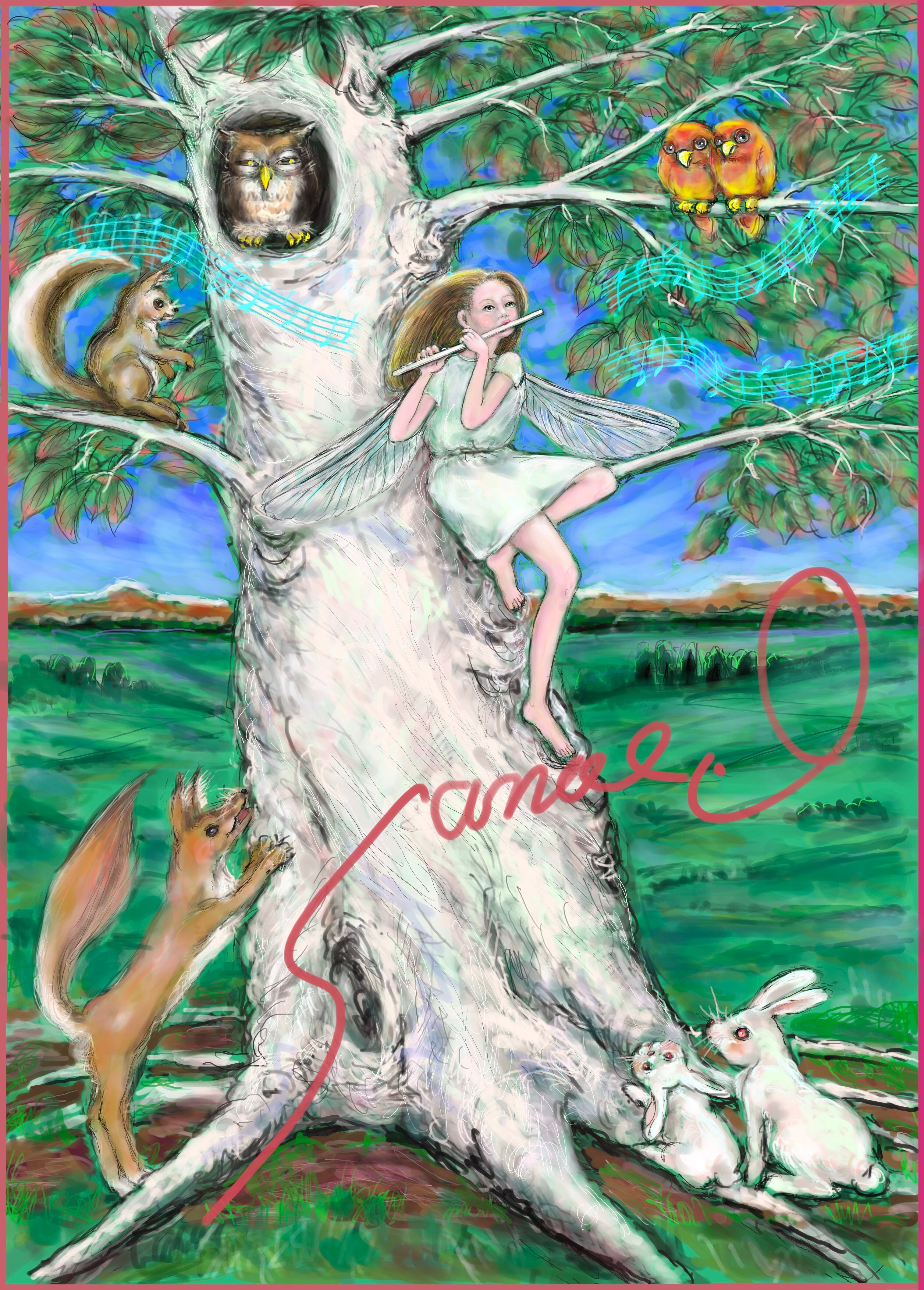野原にフルートの美しい曲が聞こえると動物や小鳥たちが集まってきます。優しい笛の音は風に乗り遠くまで流れて行きます。優しい音色に心満たされ皆んなうっとりとしています。