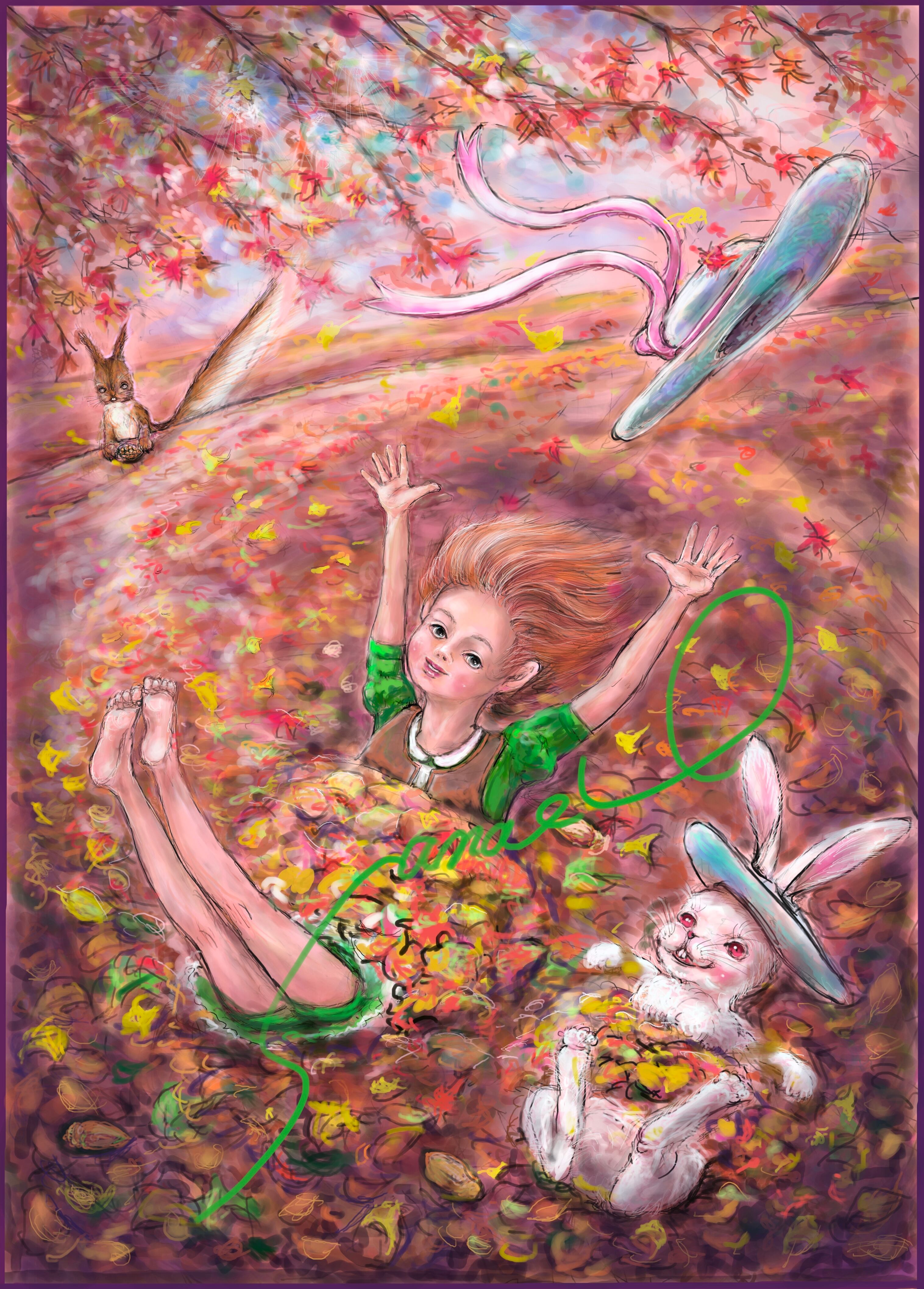 みどりちゃんとうさぎさんはしばらく落ち葉のふとんの温もりを楽しみます。秋が終わる前の