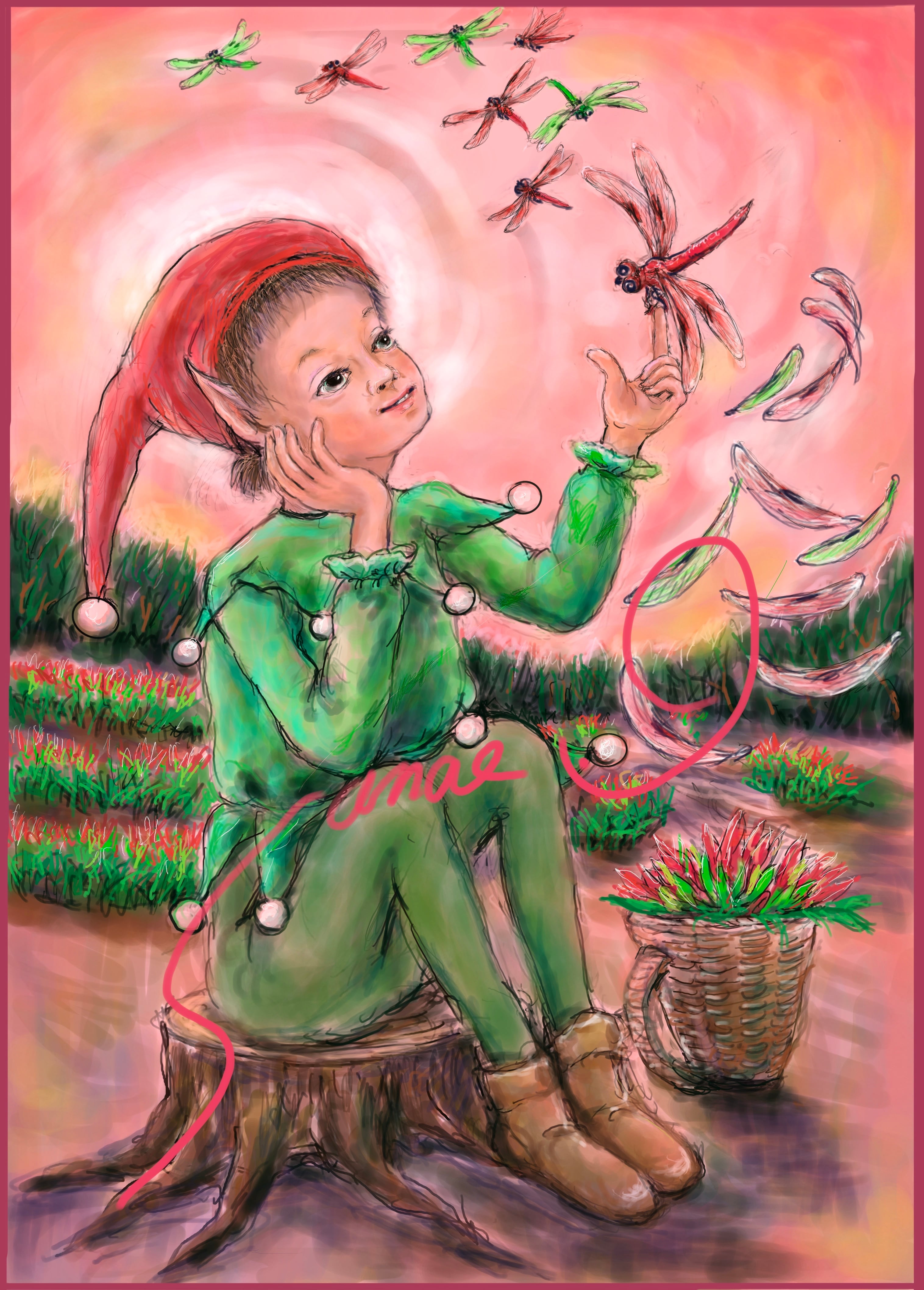 小人族のこの子は少し魔法が使えます。とうがらしを収穫していると、とうがらしが一度で良いから空を飛びたいと言います。羽根を付けてあげると、皆、大喜びであかね色の空に飛んで行きました。ピクルスを漬ける時は戻って来てねと皆んなに言い聞かせます。