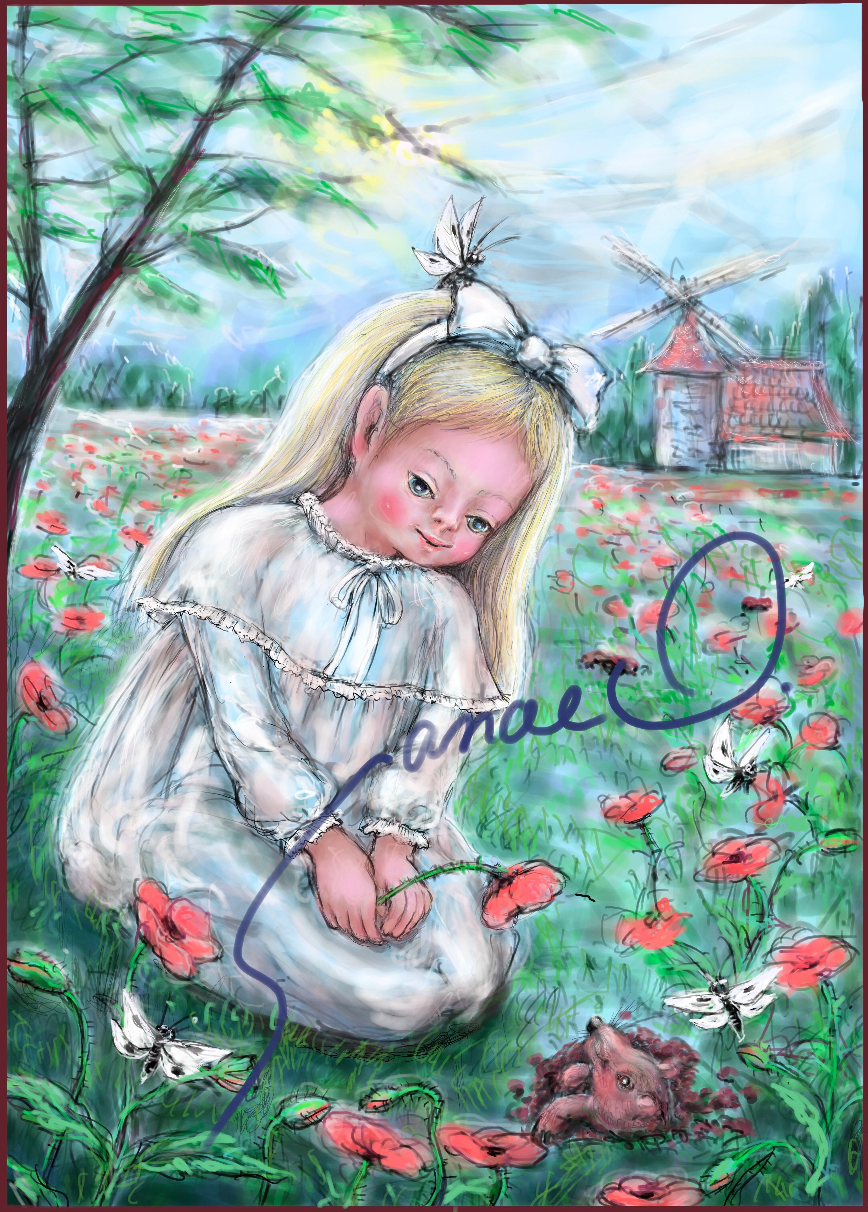 赤いひなげしが咲いた丘で花を摘んでいるとモクモクもぐらが出てきました。水車小屋の方からずっとトンネルを掘って来たそうです。おしゃべりのもぐらは身体の幅だけ土を掘り、かいたつちを出すためときどき地上に出ること、土の中で虫などの食べ物を探していること、目が悪い事、とても強いシャベルのような手を持っていることなど一気にしゃべります。