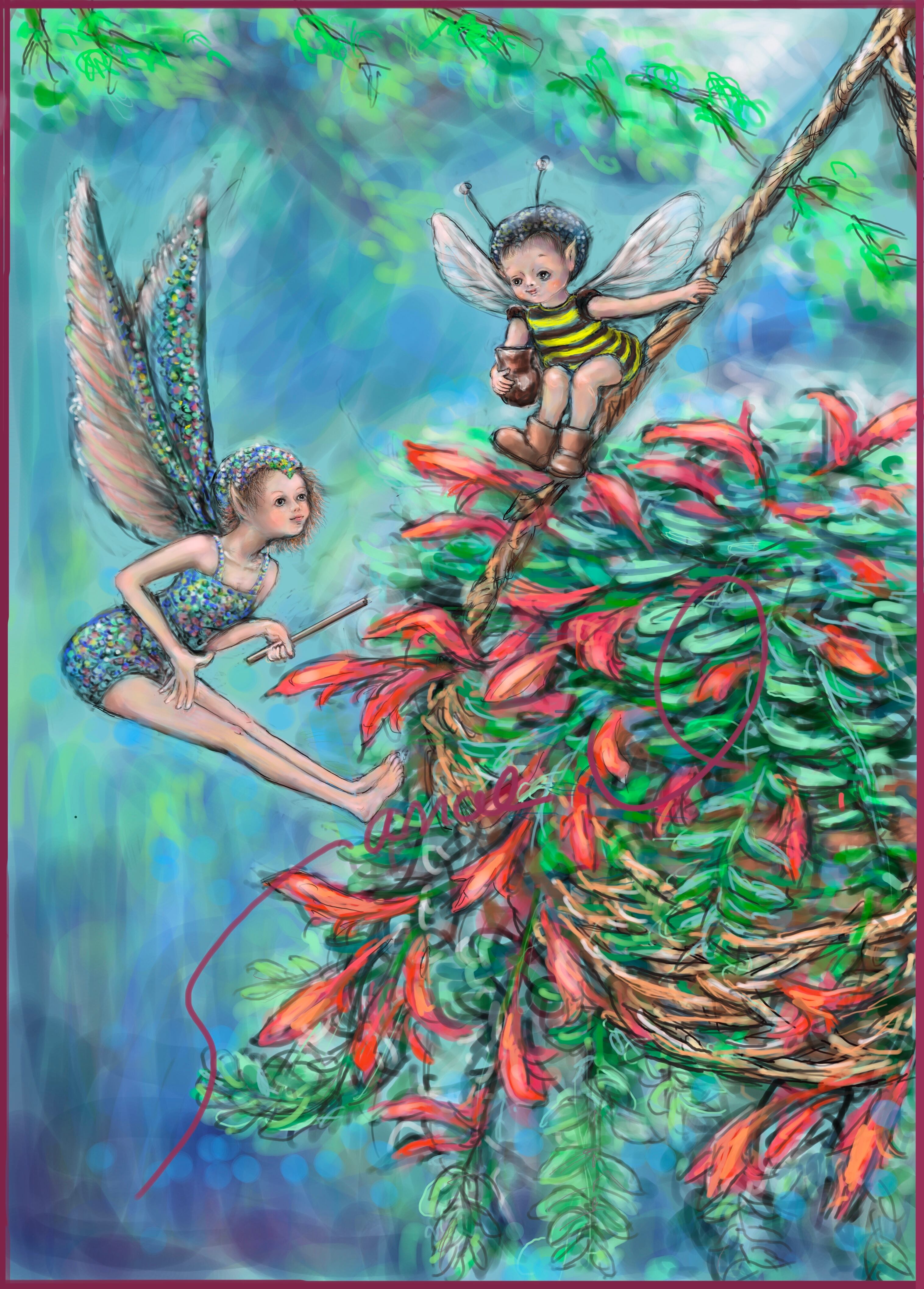 コルムネアの吊り鉢のところで、ミツバチの男の子に会いました。男の子は小さな壷に花の蜜を集めています。小さな兄弟たちの為朝から働いているのです。ハチドリのフェアリーは自分の為に